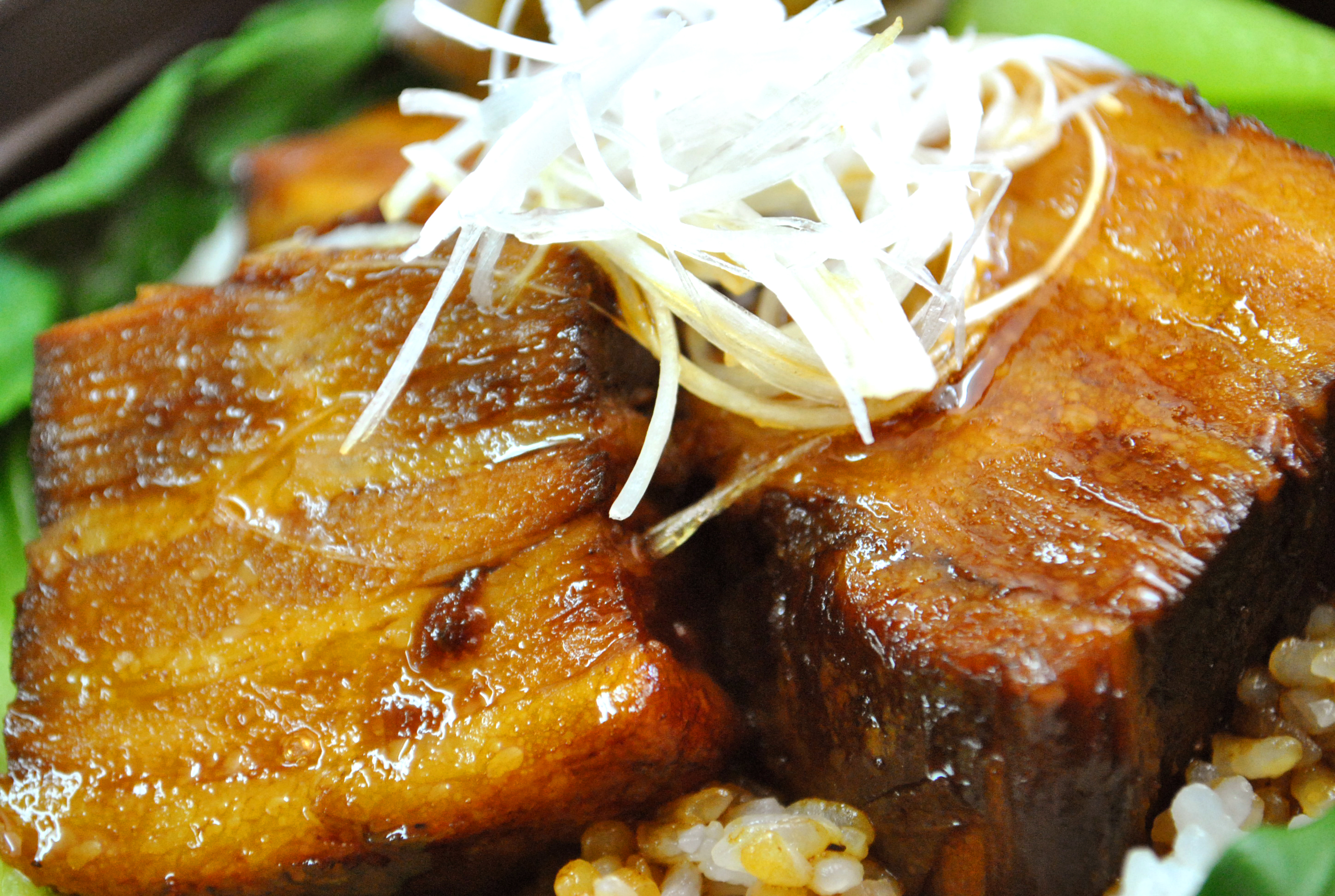 豚肉をじっくり煮込んで甘辛いタレをしっかりと染み込ませて、チンゲン菜や白髪ネギと共に、ご飯の上に豪快に乗せた1品です